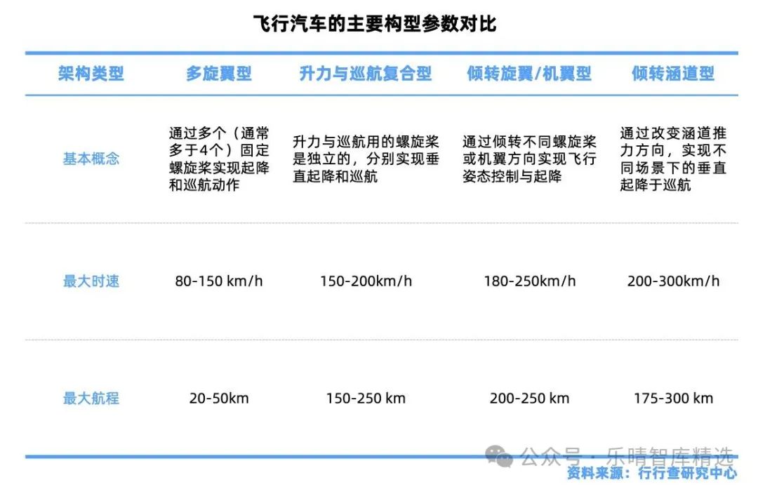 飛行汽車主要架構包括多旋翼型、升力與巡航復合型、傾轉旋翼/機翼型、傾轉涵道型。