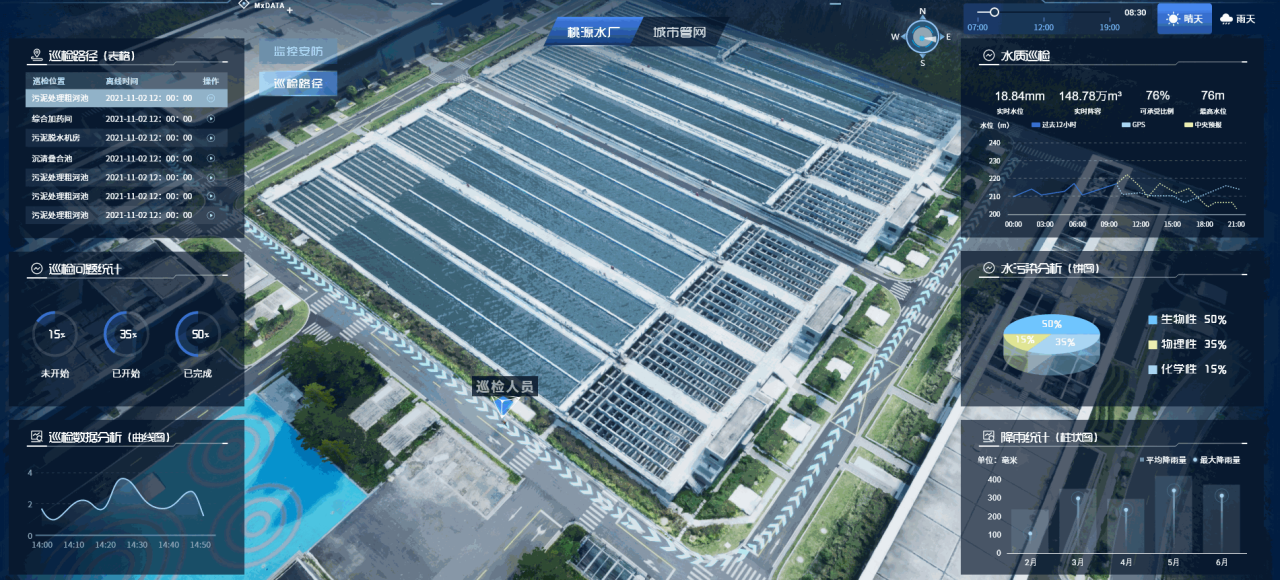 該項(xiàng)目位于位于福建省,設(shè)計(jì)規(guī)模10萬(wàn)m³/d,項(xiàng)目旨在通過(guò)打造該水廠數(shù)字孿生可視化管理平臺(tái),提高水廠智能化管理水平。基于BIM數(shù)據(jù)或CAD圖紙,項(xiàng)目對(duì)廠區(qū)進(jìn)行三維建模,還原廠區(qū)建筑物、構(gòu)筑物、工藝區(qū)間、設(shè)備等三維全貌,實(shí)時(shí)監(jiān)控廠區(qū)各項(xiàng)參數(shù),提供數(shù)據(jù)展示,設(shè)備信息查看等功能,為運(yùn)營(yíng)管理提供場(chǎng)景式的決策支持;采用3D渲染技術(shù)及VR虛擬現(xiàn)實(shí)技術(shù),打造沉浸式、智慧化的運(yùn)營(yíng)管理模式。正泰中自的水務(wù)數(shù)字孿生技術(shù)可以幫助智慧水廠更好地集成和理解生產(chǎn)信息、提升管理效能。