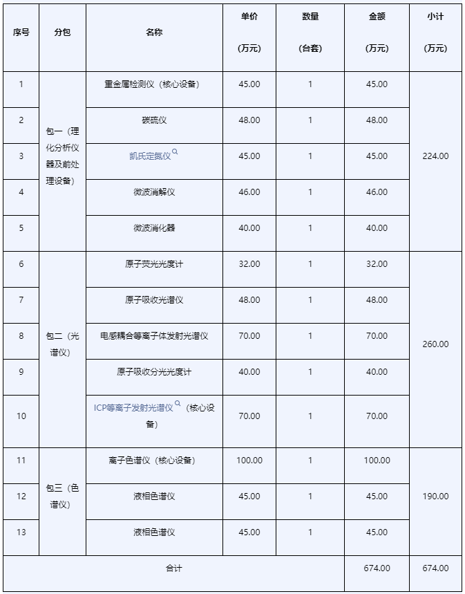 包一:理化分析儀器及前處理設備。單臺設備最高限價:厭氧工作站 1(臺套)29萬元 、多功能酶標儀1(臺套)28萬元、全自動氨基酸分析儀1(臺套)52萬元 、超級微波化學平臺1(臺套)70萬元 、微量閉口閃點儀1(臺套)35萬元 、自動電位滴定儀1(臺套)27萬元 。合計最高限價:241萬元。