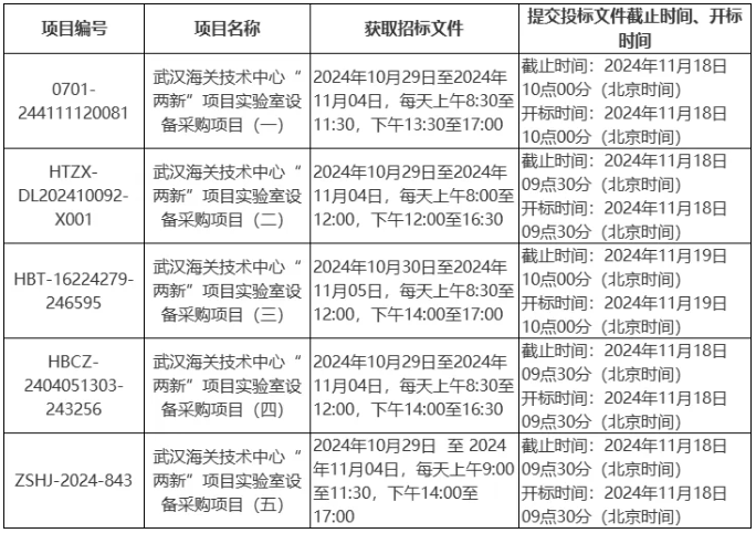 近日,武漢海關(guān)技術(shù)中心就“武漢海關(guān)技術(shù)中心“兩新”項目實驗室設備采購項目”發(fā)布五則公開招標公告,預算金額共計2740萬元。項目的的潛在投標人應在武漢市江岸區(qū)金橋大道107號凱信大廈1號樓2105室獲取招標文件。