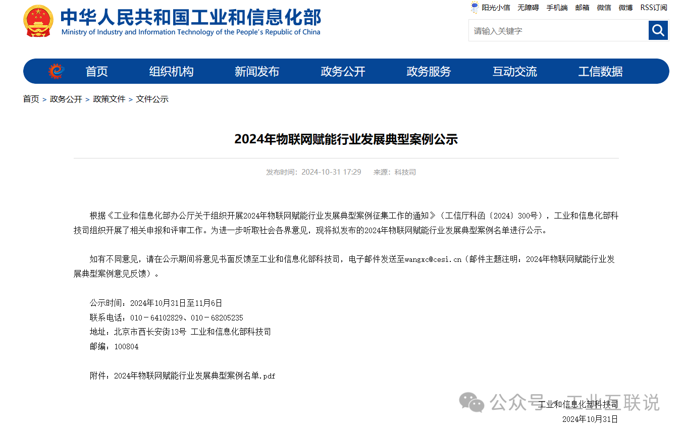 1031日消息,工信部官方發布2024年物聯網賦能行業發展典型案例公示。