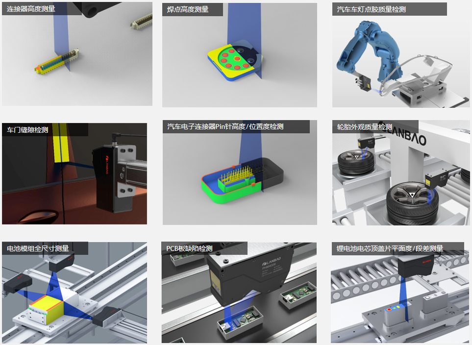 蘭寶激光線掃描3D視覺傳感器是集圖像采集、圖像處理、智能標定、應用算法于一體的超高集成度智能傳感器。突破了全自動標定技術,優化了材料工藝設計等,能夠實現高精度測量;利用自主研發的偏振調制技術,能夠對特殊被測面進行穩定檢測;采用自主研發的“ASALI”技術,保證信號光強度不變,能夠實現抗強環境光干擾,具有高環境適用性。產品重復精度±0.1um,X軸分辨率4.8-5.2um,達到國內領先水平。Z軸線性度達0.008%,處于國際領先水平。產品內置強大的算法平臺,包含角度檢測、平整度檢測、尺寸測量等諸多算法工具,同時提供配套的視覺軟件,可實現參數配置、算法工具配置、AI檢測等功能。目前已滲透消費、軍事、工業領域,在汽車行業、鐵路建設養護、飛機船舶制造、3C電子行業、半導體行業、LCD行業、鋰電行業、金屬制造、電子/電氣部件、塑料/橡膠/薄膜行業、OA/多媒體、工廠自動化等領域有著廣泛應用,如汽車擋風玻璃尺寸檢測、手機蓋板膠路檢測、芯片針腳共面度檢測、電池焊縫檢測、電路板錫膏厚度檢測、薄膜厚度檢測等等。值得一提的是,該傳感器內部的關鍵器件已基本實現了國產替代,確保了產品的完全自主可控。