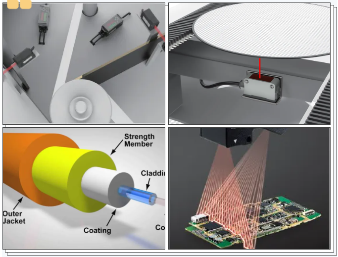 (左上)光伏行業卷繞糾偏 (左下)晶圓定位測量 (右上)光纖偏移測量 (右下)PCB質量檢測