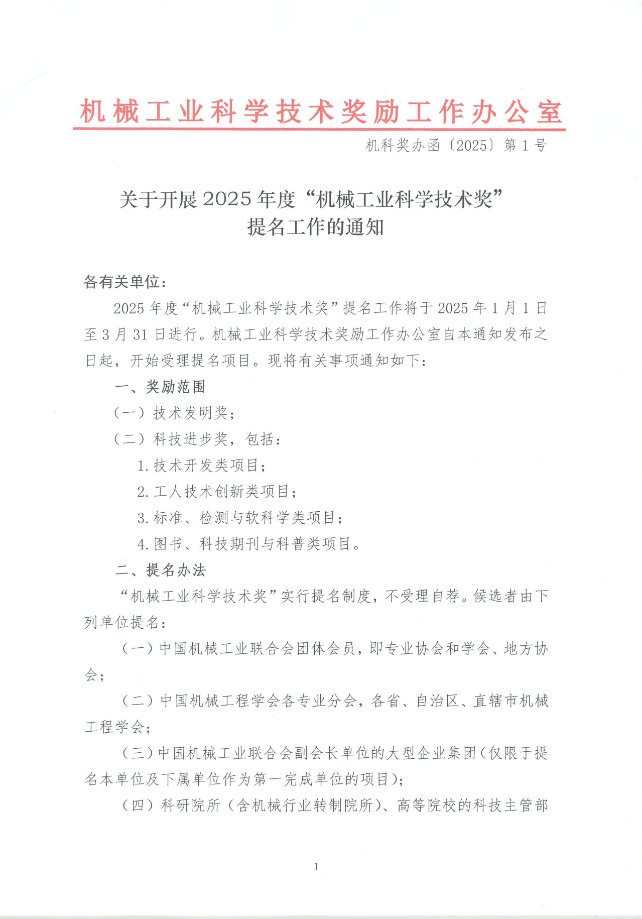 2025年度“機械工業科學技術獎”提名工作將于2025年1月1日至3月31日進行。機械工業科學技術獎勵工作辦公室自本通知發布之日起,開始受理提名項目。現將有關事項通知如下:(詳見通知正文)