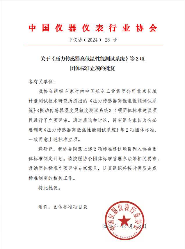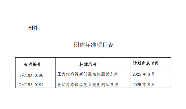 根據(jù)《中國儀器儀表行業(yè)協(xié)會團(tuán)體標(biāo)準(zhǔn)管理辦法》的規(guī)定,經(jīng)審查,對由中國航空工業(yè)集團(tuán)公司北京長城計量測試技術(shù)研究所(簡稱“304所”)提出的《壓力傳感器高低溫性能測試系統(tǒng)》 《振動傳感器高低溫性能測試系統(tǒng)》2項團(tuán)體標(biāo)準(zhǔn)進(jìn)行立項(標(biāo)準(zhǔn)編號和標(biāo)準(zhǔn)名稱見公告附件),特此公告。