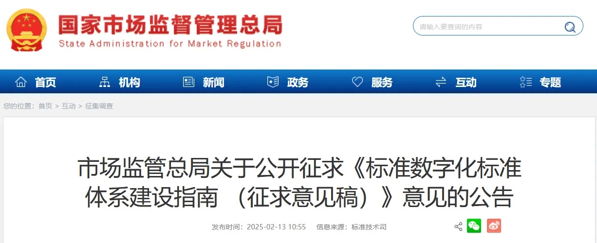為推動標(biāo)準化工作向數(shù)字化、網(wǎng)絡(luò)化、智能化轉(zhuǎn)型,充分發(fā)揮標(biāo)準的基礎(chǔ)性、引領(lǐng)性作用,市場監(jiān)管總局起草了《標(biāo)準數(shù)字化標(biāo)準體系建設(shè)指南 (征求意見稿)》(以下簡稱《建設(shè)指南》),并向社會公開征求意見,意見反饋截止日期為2025年3月12日。