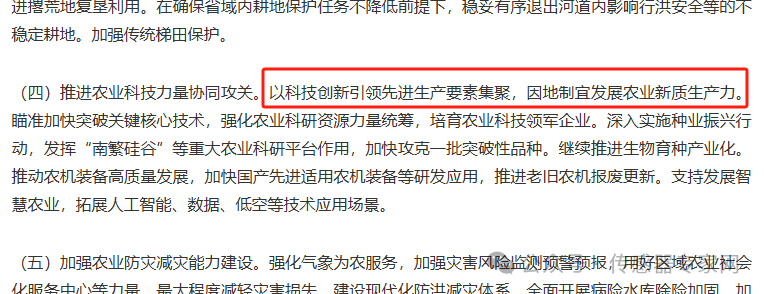 尤其值得關(guān)注的是,本次中央一號(hào)文件首次提出“農(nóng)業(yè)新質(zhì)生產(chǎn)力”概念,明確要推進(jìn)農(nóng)業(yè)科技力量協(xié)同攻關(guān):