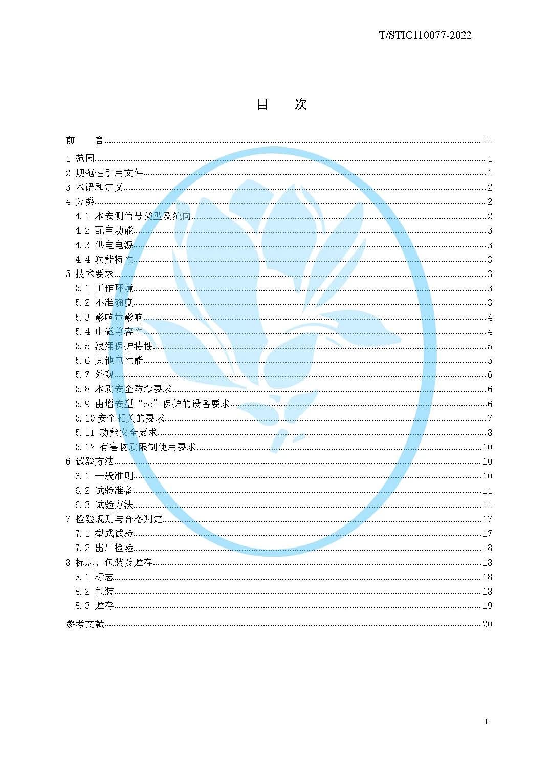 T/STIC 110077—2022《隔離式安全柵》標準規定了隔離式安全柵的分類、技術要求、試驗方法、 檢驗規則與合格判定,以及標志、包裝及貯存,適用于包括模擬信號、溫度信號和數字信號任何具有特定的輸入、輸出變量,且輸入輸出變量之間具有特定關系(傳遞函數)的信號隔離和限能功能的隔離式安全柵。