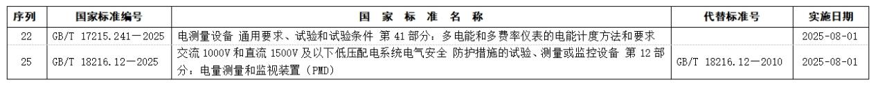 兩項(xiàng)標(biāo)準(zhǔn)分別為:GB/T 17215.241—2025《電測量設(shè)備 通用要求、試驗(yàn)和試驗(yàn)條件 第41部分:多電能和多費(fèi)率儀表的電能計(jì)度方法和要求》、GB/T 18216.12—2025《交流1000V和直流1500V及以下低壓配電系統(tǒng)電氣安全 防護(hù)措施的試驗(yàn)、測量或監(jiān)控設(shè)備 第12部分:電量測量和監(jiān)視裝置(PMD)》。