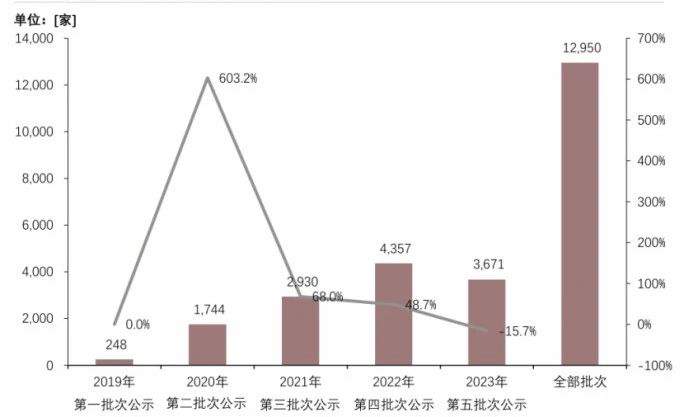 自2019年啟動專精特新“小巨人”企業培育工作以來,企業數量呈階段性變化。早期認定數量穩步增長,進入“十四五”時期,隨著培育工作上升至國家戰略高度,相關政策不斷完善,如《“十四五”促進中小企業發展規劃》明確培育目標,《優質中小企業梯度培育管理暫行辦法》細化評定標準,地方政府也紛紛出臺配套政策,推動2021—2022年企業認定數量快速攀升。但現階段認定速度有所放緩,第五批次認定數量相比第四批次有所減少。