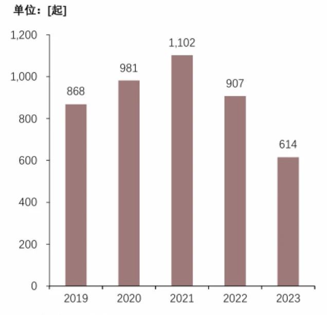在政策引導下,“專精特新”領域吸引大量投資,投融資活躍度較高。截至2023年,4233家專精特新“小巨人”企業獲得戰略融資,309家企業獲得A輪融資。但仍有8536家企業未獲得融資,融資滲透率僅50%。從融資時間分布來看,2019—2021年融資事件逐漸增多,2021年達到1102次,之后熱度有所下降,2023年發生融資614次。未來提升融資滲透率,實現知識產權投融資全覆蓋是發展重點。