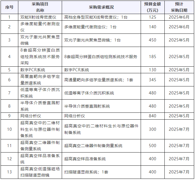 近期,復旦大學連續發布13項儀器采購意向,預算總金額4775萬元。涉及儀器設備包括雙能X線骨密度儀、多維度能量代謝測定儀、雙光子激光共聚焦顯微鏡、數字PCR系統、低溫等離子體介質沉積系統、超高真空樣品準備系統、掃描隧道顯微系統等。預計采購時間20255~7月。