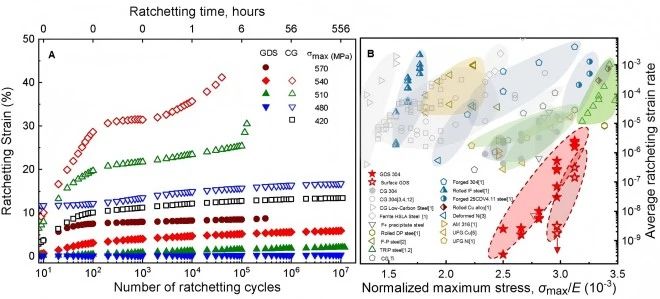 盧磊研究團(tuán)隊(duì)與海外合作者共同提出了一種基于梯度位錯(cuò)結(jié)構(gòu)的高強(qiáng)度材料抗疲勞策略,通過在傳統(tǒng)304奧氏體不銹鋼中引入空間梯度序構(gòu)位錯(cuò)胞結(jié)構(gòu),成功實(shí)現(xiàn)了高強(qiáng)度與優(yōu)異抗循環(huán)蠕變性能的協(xié)同優(yōu)化。該策略使材料屈服強(qiáng)度提升了2.6倍;與具有相同強(qiáng)度的不銹鋼及其他合金相比,其棘輪應(yīng)變速率降低了2-4個(gè)數(shù)量級(jí)(圖),突破了結(jié)構(gòu)材料抗棘輪損傷性能難以提升的技術(shù)瓶頸。