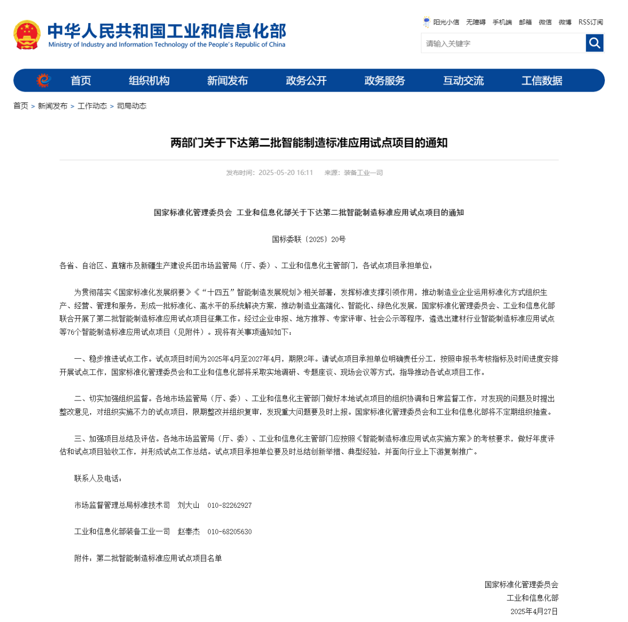 經(jīng)過企業(yè)申報、地方推薦、專家評審、社會公示等程序,國家標準化管理委員會、工業(yè)和信息化部近日下達第二批智能制造標準應用試點項目名單,中核控制系統(tǒng)工程有限公司的“核設施DCS裝備智能制造標準應用試點”,浙江萬勝智能科技股份有限公司的“智能配用電智能工廠標準應用試點”,福建順昌虹潤精密儀器有限公司的“面向智能儀表生產(chǎn)的智能工廠標準應用試點”,三川智慧科技股份有限公司的“智能水表智能工廠建設標準應用試點”等76個智能制造標準應用試點項目進入名單。試點項目時間為2025年4月至2027年4月,期限2年。