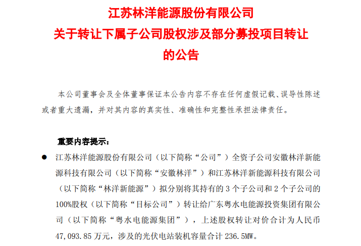 6月3日,林洋能源(601222)公告,公司全資子公司安徽林洋擬將其持有的濉溪縣永瑞現(xiàn)代農(nóng)業(yè)科技有限公司、濉溪永暉新能源科技有限公司、阜陽永明農(nóng)業(yè)太陽能發(fā)電有限公司3個子公司100%股權(quán)轉(zhuǎn)讓給粵水電能源集團;全資子公司林洋新能源擬將其持有的江蘇飛展能源科技有限公司和連云港林洋新能源有限公司2個子公司100%股權(quán)轉(zhuǎn)讓給粵水電能源集團,上述股權(quán)轉(zhuǎn)讓對價合計為人民幣47,093.85萬元,涉及的光伏電站裝機容量合計236.5MW,包括部分公司第二次非公開發(fā)行股票和公開發(fā)行可轉(zhuǎn)債募投項目。