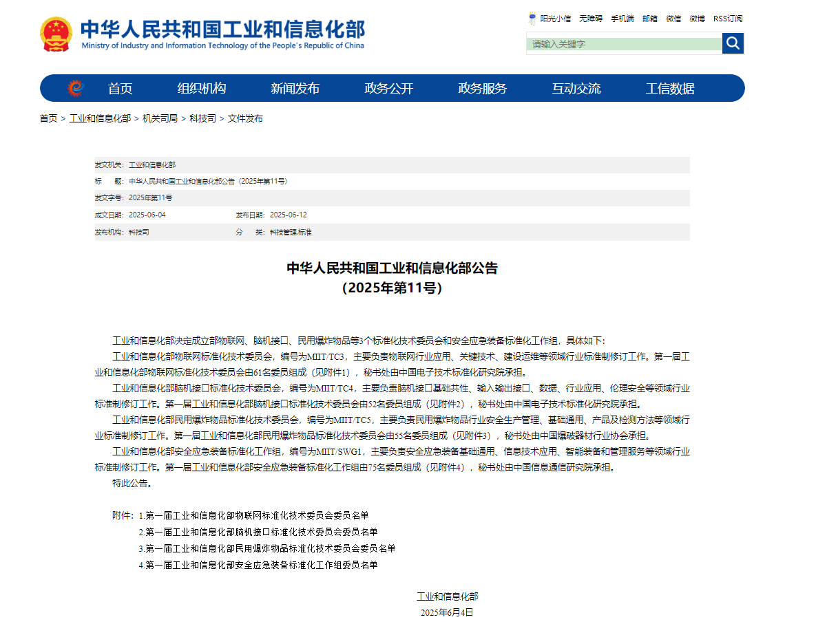 公告顯示,此次新成立的四個標準化組織,各有其明確的職責與定位。工業和信息化部物聯網標準化技術委員會,主要負責物聯網行業應用、關鍵技術、建設運維等領域行業標準制修訂工作;工業和信息化部腦機接口標準化技術委員會,則聚焦于腦機接口基礎共性、輸入輸出接口、數據、行業應用、倫理安全等領域的行業標準制定;工業和信息化部民用爆炸物品標準化技術委員會,主要針對民用爆炸物品行業安全生產管理、基礎通用、產品及檢測方法等領域開展行業標準制修訂工作;而工業和信息化部安全應急裝備標準化工作組,主要負責安全應急裝備基礎通用、信息技術應用、智能裝備和管理服務等領域行業標準制修訂工作。