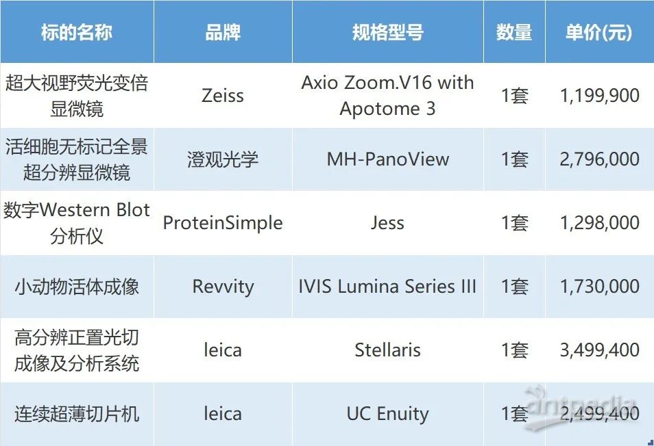 近日,中國科學院基礎醫(yī)學與腫瘤研究所(籌)(簡稱“中科院醫(yī)學所”)一批尖端科研設備成功中標,總中標金額達1302.27萬元。此次中標設備涵蓋超大視野熒光變倍顯微鏡、活細胞無標記全景超分辨顯微鏡、數字 Western Blot 分析儀、小動物活體成像等,品牌包括蔡司、澄觀光學、ProteinSimple、瑞孚迪和徠卡。這批設備的引入,將為研究所的研究注入強大動力。