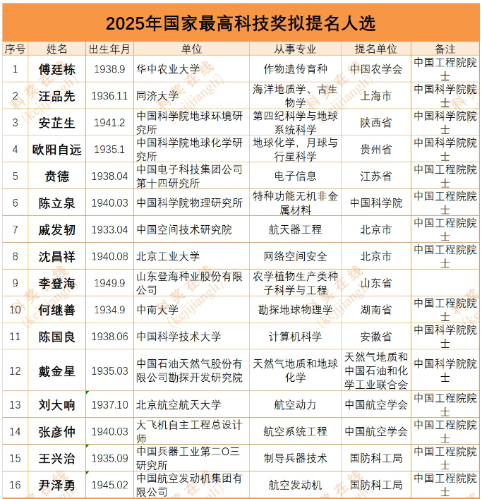 國家最高科學技術獎,作為中國科技界的最高榮譽,每年評選不超過兩名,旨在表彰在科學技術領域作出杰出貢獻的科學家。目前有16名科學家擬提名國家最高科技獎,其中院士15人。