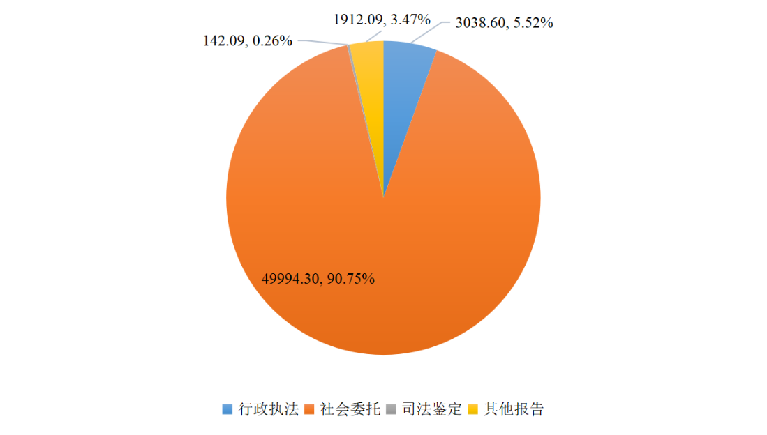 2024年共出具檢驗(yàn)檢測(cè)報(bào)告5.51億份,同比下降8.66%,平均每天對(duì)社會(huì)出具各類(lèi)報(bào)告150.92萬(wàn)份。其中,出具行政執(zhí)法類(lèi)報(bào)告3038.60萬(wàn)份,占比5.52%,同比下降8.25%;出具社會(huì)委托類(lèi)報(bào)告49994.30萬(wàn)份,占比90.75%,同比下降7.06%;出具司法鑒定類(lèi)報(bào)告數(shù)142.09萬(wàn)份,占比0.26%,同比增長(zhǎng)0.76%。
