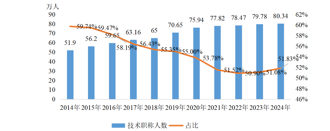 圖1-4 2014-2024年全國(guó)檢驗(yàn)檢測(cè)機(jī)構(gòu)擁有技術(shù)職稱(chēng)人員分布情況
