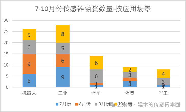 從融資數(shù)量上看,工業(yè)、汽車、機(jī)器人數(shù)量居于前三位,分別是8家、6家、5家,合計占比80%。本月機(jī)器人數(shù)量略有下滑,汽車領(lǐng)域的傳感器融資數(shù)量明顯恢復(fù)。