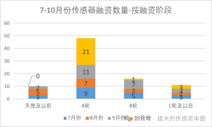 2025年7-10月份傳感器行業(yè)的融資數(shù)量和輪次統(tǒng)計如下。2025年7-10月共有85起融資案例,分別為20、17、22、25起融資,融資數(shù)量相對比較穩(wěn)定,平均每月20起左右。
