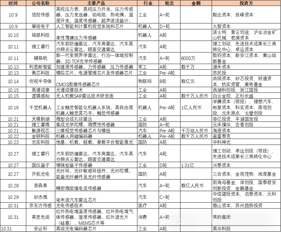 二.10月傳感器行業(yè)融資案例匯總