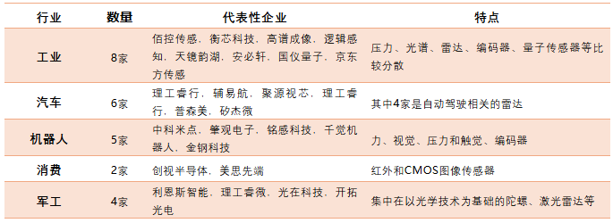 工業(yè)領(lǐng)域的項(xiàng)目仍然比較分散,壓力、光譜、雷達(dá)等產(chǎn)品都有涉及;汽車領(lǐng)域應(yīng)用比較集中,大部分集中在與自動駕駛相關(guān)的傳感器上;機(jī)器人不再像以前的六維力和觸覺那樣集中,投資人開始關(guān)注不同的傳感器類型了。