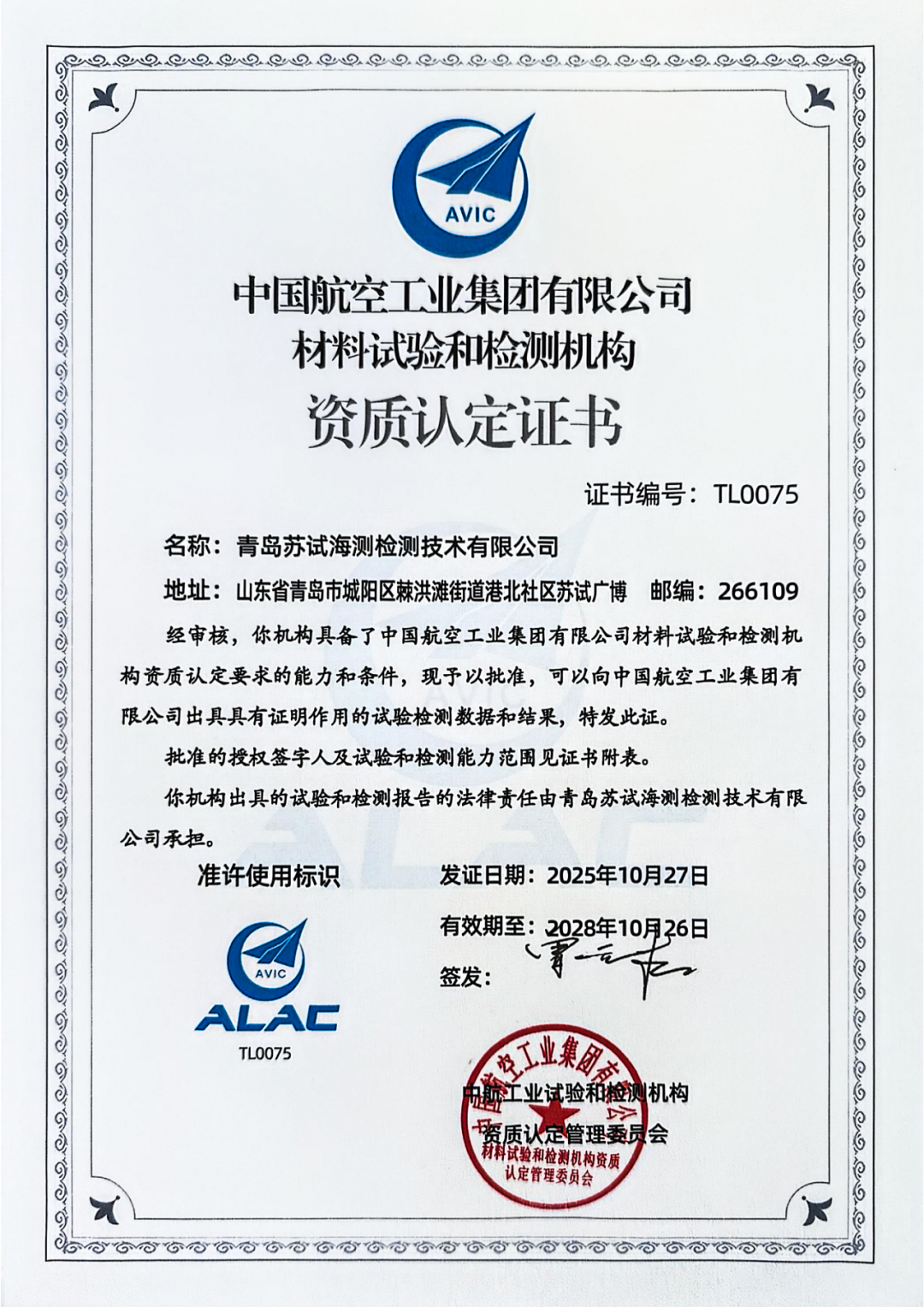 近日,蘇試試驗青島實驗室正式獲得中國航空工業(yè)材料試驗和檢測機構(gòu)資質(zhì)認(rèn)定(ALAC)證書,標(biāo)志著其在金屬材料力學(xué)性能檢測領(lǐng)域的技術(shù)能力與管理水平,已符合航空工業(yè)高標(biāo)準(zhǔn)要求。