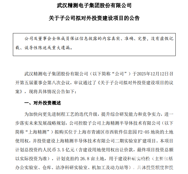 12月12日,精測電子(300567.SZ)公布,為加快向更先進制程工藝的迭代升級,提升綜合研發(fā)能力和競爭實力,進一步落實未來發(fā)展戰(zhàn)略規(guī)劃,公司控股子公司上海精測半導體技術有限公司(簡稱“上海精測”)擬購買位于上海市青浦區(qū)市西軟件信息園F2-05地塊的土地使用權,并投資建設上海精測半導體技術有限公司二期實驗室擴建項目。