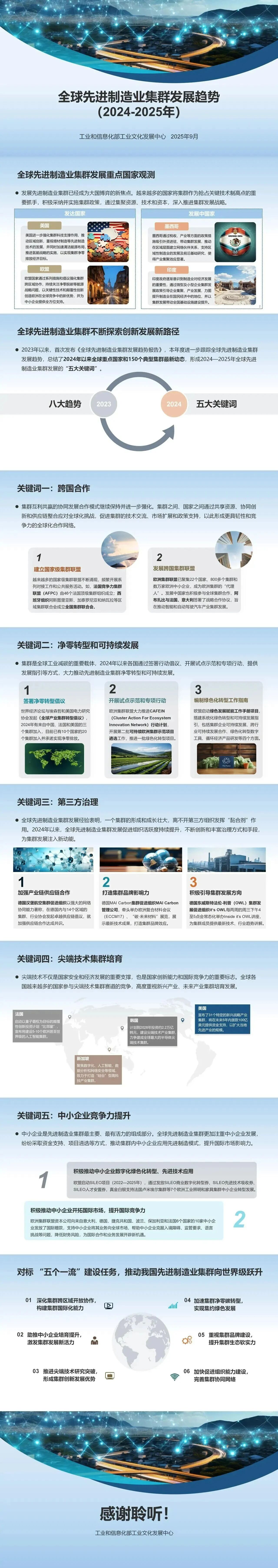 先進(jìn)制造業(yè)集群是制造業(yè)高質(zhì)量發(fā)展的核心趨勢,也是制造強(qiáng)國戰(zhàn)略布局的關(guān)鍵重點(diǎn),對推進(jìn)新型工業(yè)化、保障產(chǎn)業(yè)鏈供應(yīng)鏈安全、構(gòu)筑大國經(jīng)濟(jì)安全屏障具有重要意義。黨中央、國務(wù)院高度重視其培育發(fā)展,習(xí)近平總書記作出系列重要指示,黨的二十屆三中全會也提出明確要求。在新一輪科技革命和產(chǎn)業(yè)變革深入演進(jìn)、全球產(chǎn)業(yè)鏈供應(yīng)鏈加速重構(gòu)的背景下,課題組以全球 150 個典型集群為跟蹤樣本,延續(xù)往年研究基礎(chǔ),梳理 2024 年以來全球重點(diǎn)國家及集群最新動態(tài),提煉出五大年度關(guān)鍵詞,并形成我國集群培育提升的相關(guān)建議,為政府、相關(guān)組織及企業(yè)提供參考。