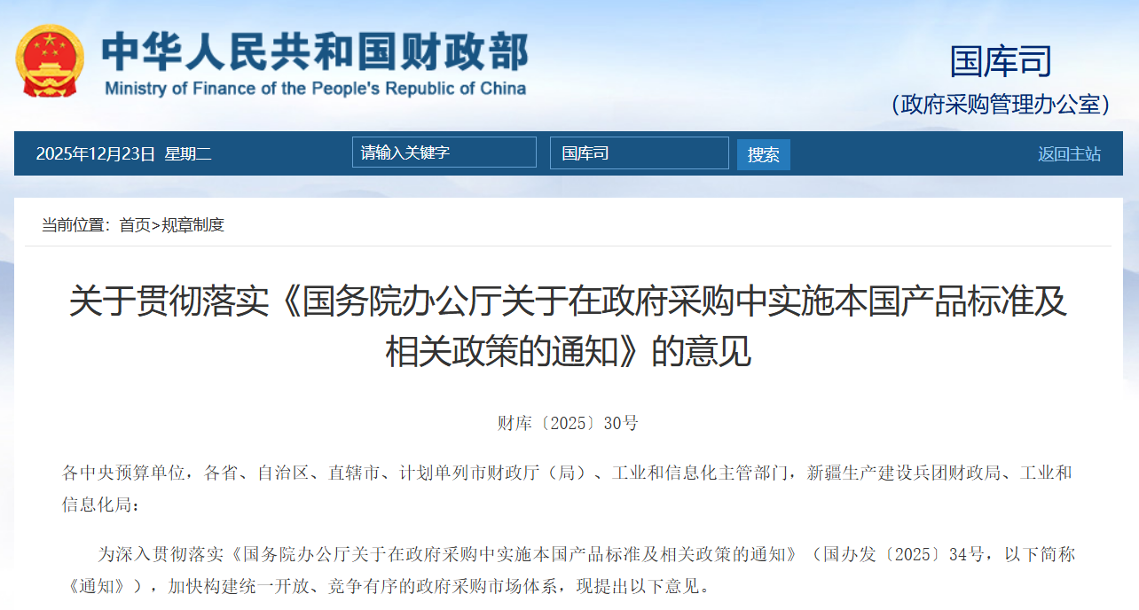 《通知》以習(xí)近平新時(shí)代中國(guó)特色社會(huì)主義思想為指導(dǎo),全面貫徹黨的二十大和二十屆歷次全會(huì)精神,緊扣高質(zhì)量發(fā)展要求,結(jié)合我國(guó)發(fā)展實(shí)際,對(duì)接國(guó)際高標(biāo)準(zhǔn)經(jīng)貿(mào)規(guī)則,系統(tǒng)提出了構(gòu)建政府采購(gòu)中本國(guó)產(chǎn)品標(biāo)準(zhǔn)體系以及對(duì)本國(guó)產(chǎn)品予以支持的工作要求,為進(jìn)一步保障各類經(jīng)營(yíng)主體平等參與政府采購(gòu)活動(dòng)提供了制度依據(jù)。