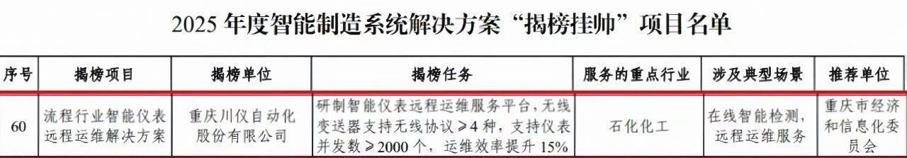 重慶川儀自動化股份有限公司(以下簡稱“川儀股份”)“流程行業智能儀表遠程運維解決方案”成功上榜工信部2025年度智能制造系統解決方案“揭榜掛帥”項目名單。