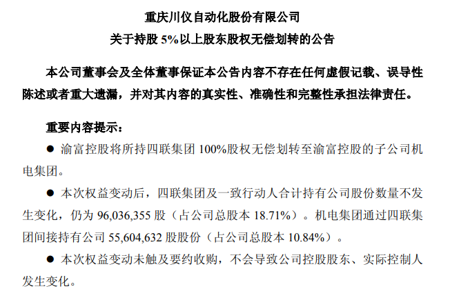 130日,川儀股份(603100)公告,渝富控股將所持四聯集團100%股權無償劃轉至渝富控股的子公司機電集團。本次權益變動后,四聯集團及一致行動人合計持有公司股份數量不發生變化,仍為96,036,355(占公司總股本18.71%)。機電集團通過四聯集團間接持有公司55,604,632 股股份(占公司總股本10.84%)