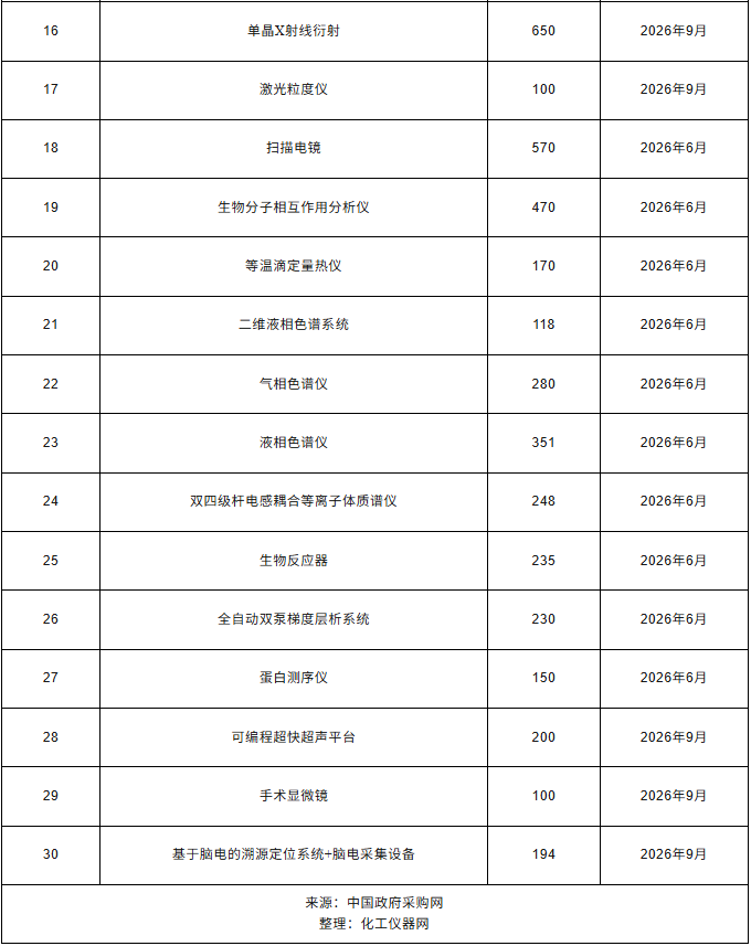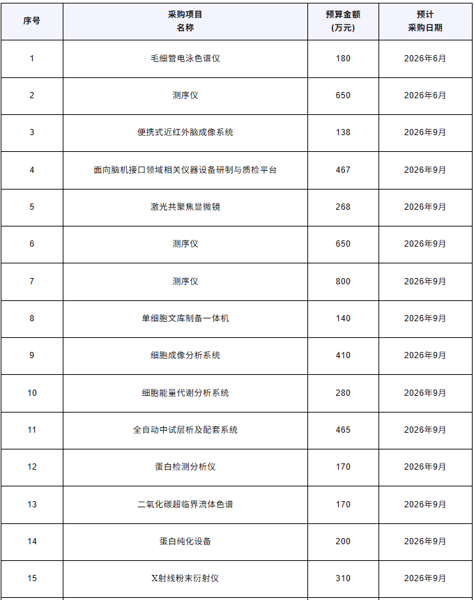 近日,南京醫(yī)科大學(xué)發(fā)布2026年2月(第2批)政府采購(gòu)意向公告,計(jì)劃采購(gòu)毛細(xì)管電泳色譜儀、測(cè)序儀、便攜式近紅外腦成像系統(tǒng)、激光共聚焦顯微鏡、蛋白檢測(cè)分析儀、X射線粉末衍射儀等儀器設(shè)備,總預(yù)算9364萬元,預(yù)計(jì)采購(gòu)時(shí)間2026年6月~9月。