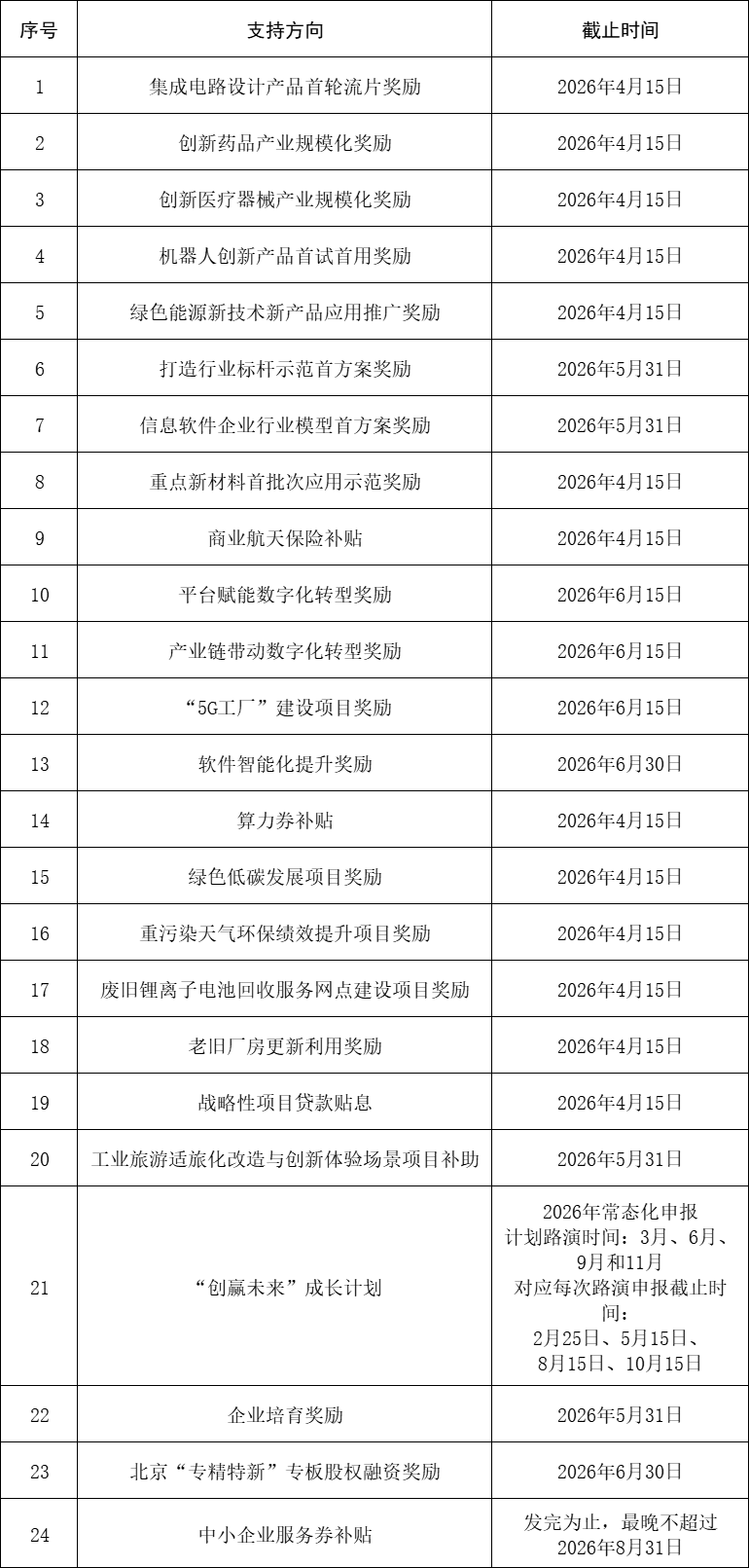 2.申報項目中已通過其他市級財政資金支持的實施內容,高精尖項目資金、中小資金原則上不再予以重復支持。同一單位原則上只能獲得2026年內高精尖項目資金單個方向支持;對落實國家重大戰略部署和北京市重點任務的,可獲得多種方式支持。對確需以高精尖項目資金、中小資金等相關專項資金管理辦法規定之外支持方式和標準支持的項目,應報市政府審定后執行。
