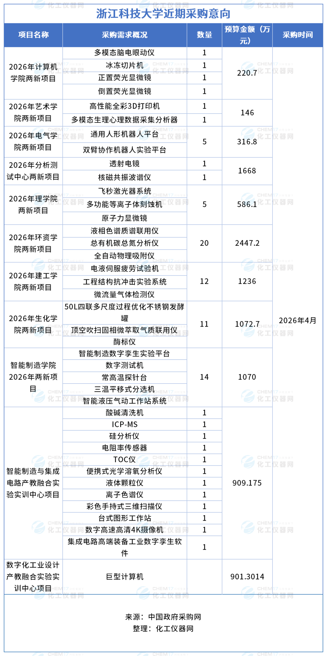 近期,浙江科技大學(xué)發(fā)布多項(xiàng)儀器采購意向,采購預(yù)算金額10573.9764萬元,涉及儀器設(shè)備包括透射電鏡、核磁共振波譜儀、飛秒激光器系統(tǒng)、多功能等離子體刻蝕機(jī)、原子力顯微鏡、液相色譜質(zhì)譜聯(lián)用儀、總有機(jī)碳總氮分析儀等。預(yù)計(jì)采購時間2026年4月。