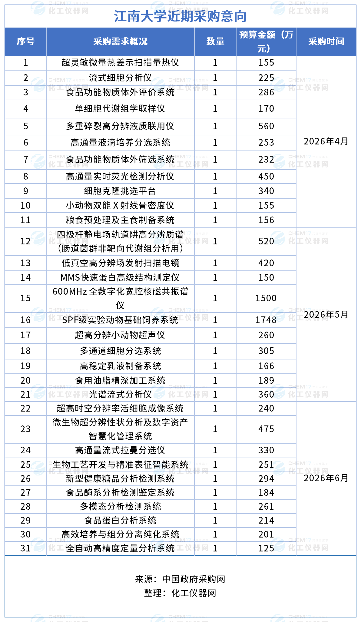 近期,江南大學發(fā)布多項儀器采購意向,采購預算金額11175萬元,涉及儀器設備包括超靈敏微量熱差示掃描量熱儀、流式細胞分析儀、食品功能物質(zhì)體外評價系統(tǒng)、單細胞代謝組學取樣儀、多重碎裂高分辨液質(zhì)聯(lián)用儀、高通量液滴培養(yǎng)分選系統(tǒng)、食品功能物質(zhì)體外篩選系統(tǒng)等。預計采購時間2026年4月-6月。